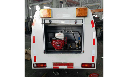 該車輛型號CLW5020GQXC4,選用的是解放汽油機底盤2.75米軸距,清洗水箱的容積1.2立方米。車輛前端有一排帶有10個高壓沖頭前沖器,車子選配意大利進口的高壓泵,壓力達到10兆帕,該車是用于清洗路面,路面的保潔養護,比如臨街餐飲路面上的油漬,城區路面因轉運泥土車的撒漏使泥土粘貼在路面上,以及其他較強力的路面附著物的清洗處理都需要使用該車,除污效果好,省時省力。
