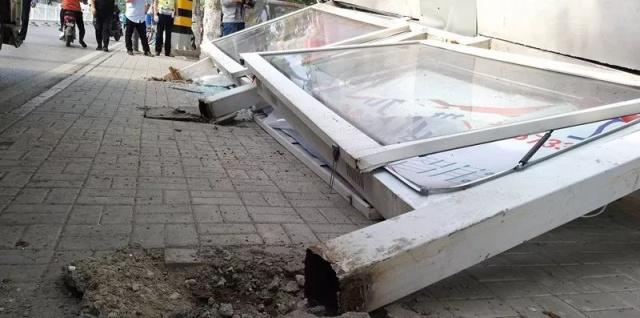 洗掃車司機(jī)說:“我每天都開車沿魏武大道東側(cè)的非機(jī)動(dòng)車道清掃,但今天下午3點(diǎn)鐘左右,因?yàn)槎惚芤惠v三輪車,無意間撞倒了站臺(tái)上的棚頂,而且旁邊停放的這輛黑色私家車也被砸壞。”