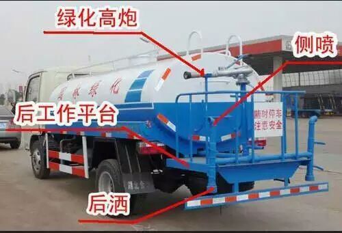 灑水車前裝有鴨形噴嘴或圓頭沖嘴,后面裝有圓柱開灑水噴嘴或蓮蓬頭噴嘴,后部有一工作平臺,裝配有水炮。后部還可裝8個噴嘴(選裝)噴水器一般用于沖洗街道,起除塵和降溫作用,其噴水器可以用調節噴嘴螺紋的方法改變噴水器的噴灑方向和角度,高射水炮可以用于城鄉園林綠化及應急消防。蓮蓬嘴可以澆落路中間噴水器沖起的灰塵,起到清潔空氣的作用。