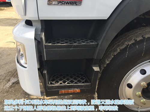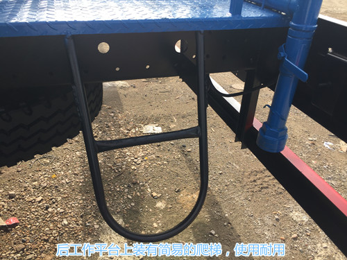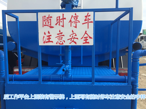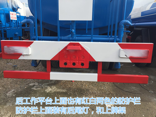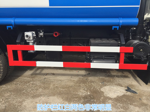 東風多利卡D9灑水車罐體下面有灑水車進水.出水以及連同的管道,管道排布整齊,一眼就能看清走向,管道到采用一次性成型鋁合金管。防腐能力強,不生銹,管道外接口處有防護欄,紅白兩色非常明顯,后工作平臺上面也有紅白兩色的防護欄,防護欄上面裝有后尾燈,和上牌架,后工作平臺上裝有簡易的爬梯,使用耐用,后工作平臺上面裝有警示牌,上面寫有隨時停車注意安全的字樣。