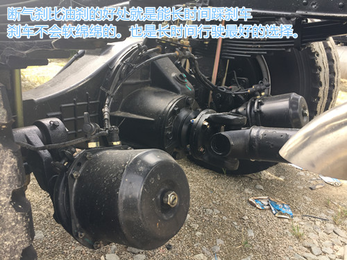 本車還有很多防護措施,列如對電瓶就防護的非常好,上面采用的是密封式蓋子,能擋風擋雨,防曬,防小偷,電瓶旁邊是兩個氣缸,這兩個氣缸就是斷氣剎儲存氣用的,只要壓力達到6才能起步,才能才剎車,斷氣剎比油剎的好處就是能長時間踩剎車,剎車不會軟綿綿的。也是長時間行駛最好的選擇。