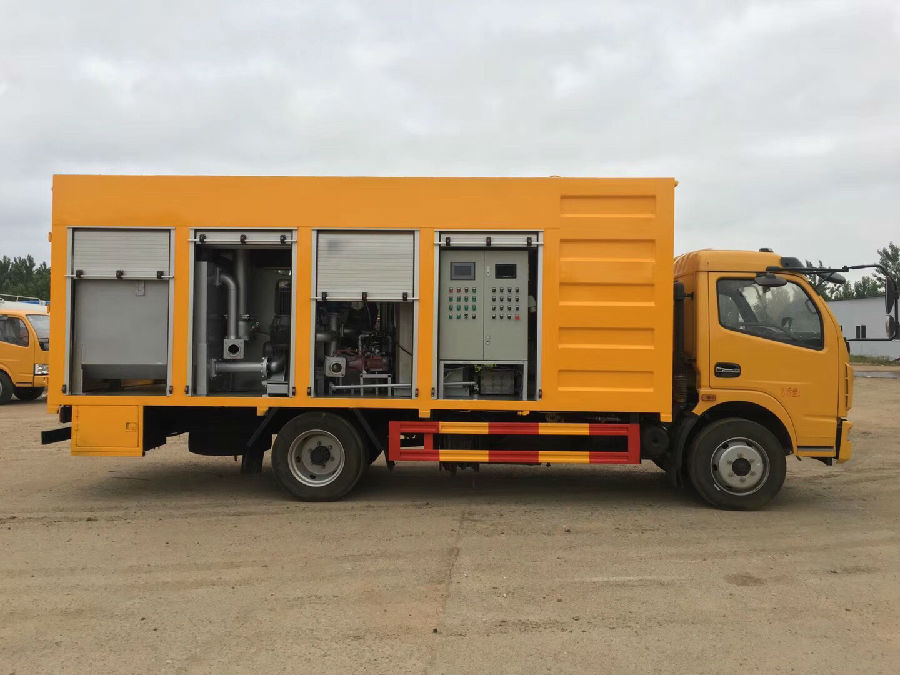 污水處理車是在二類載貨汽車地盤的基礎上加裝貨箱、分離箱、藥箱、取力器、真空泵、排污泵、凸輪轉子泵、疊螺機、LED廣告宣傳屏等專用裝置改裝而成。該車結構簡單、性能可靠、操控方便,可對化糞池快速處理。