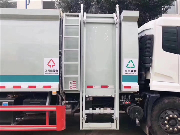 應(yīng)對垃圾分類處理號召,程力公司先行推出分類式餐廚壓縮垃圾車。新公告車型,東風(fēng)天錦分撿垃圾運(yùn)輸車,整車分兩部分,箱體前帶4立方掛桶垃圾箱,側(cè)邊帶自卸三角垃圾斗,為可回收垃圾區(qū)。后帶8立方壓縮垃圾箱,尾部帶掛桶翻轉(zhuǎn)機(jī)構(gòu),為不可回收垃圾區(qū)。分區(qū)分類,利國利民。