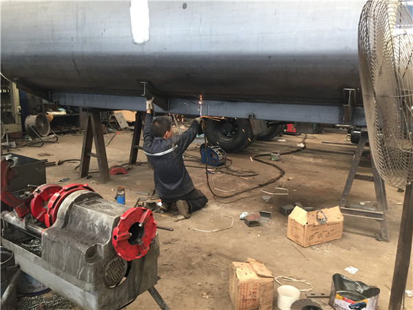 灑水車罐體在焊接工位上采用氣體保護焊接自動焊接而成,保證罐體焊縫質量的原樣性。罐體的長度采用一次成型的整體式縱梁焊接,確保罐體的強度,罐體要進行整體噴丸工藝處理,以消除焊縫應力和整體除銹。
