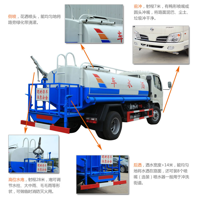 用戶可自帶底盤我廠提供上裝部件的生產(chǎn)改裝,我生產(chǎn)的灑水車均為多功能綠化噴灑車,可滿足不同用戶在不同的使用環(huán)境中使用: