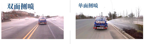 灑水車前噴頭位置較低,靠近地面,噴灑壓力較大,可用于沖洗路面;后噴頭位置較高(灑水車后噴頭一般左右各安裝一個),灑水面較寬,可用于公路施工灑水,使用后噴頭時,應將前噴管關閉;使用可調噴頭灑水時,灑水寬度可根據需要調整。灑水寬度越寬,中間重疊量越少,灑水密度越均勻。
