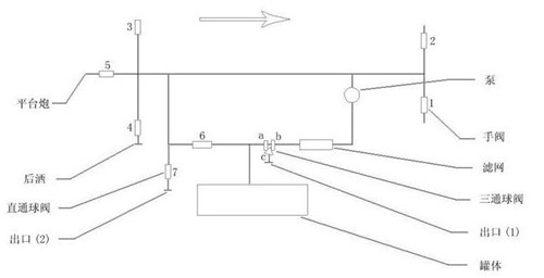 工作水路示意:水經(jīng)過罐體出口、三通球閥 G、過濾網(wǎng)、泵、前沖后灑和花撒。(其中 H、I 關(guān)閉)。