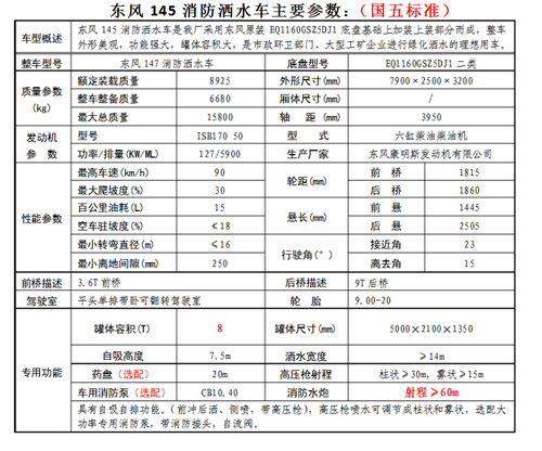 東風145消防灑水車整車型號:CLW5165GPST5;發動機:玉柴/康明斯;免征公告:有;罐體容積:12立方;環保公告:有;底盤型號:EQ1160GD5DJ;灑水寬度:20米;垂直吸程:8米;水炮揚程:35米;軸距:3950mm;上戶噸位:9噸;排放標準:國五;外形尺寸:7790X2500X3200;輪胎型號:9.00-20;側噴面積:>80平方米;后灑面積:>15平方米;水泵轉速:1180r/min。