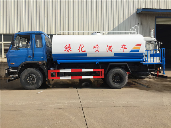 東風153灑水車改裝配置:罐體采用4MM厚武鋼專用容積板制作,實際容積15立方,前沖后灑側噴,高位花灑,后工作平臺及綠化高炮,配專用水泵(泵進泵出)及消防栓接口,兩根等長輸水管,金屬漆,其余標配。用戶可選裝消防大功率消防水泵、應急時可做消防灑水車使用。