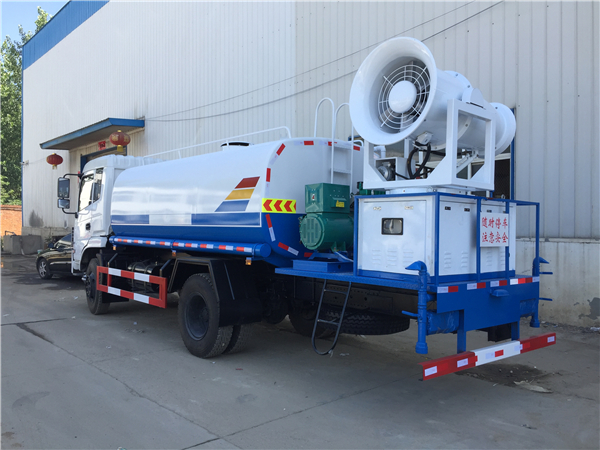 東風12噸抑塵車選配50米噴霧機達到除塵效果。霧炮機是根據風送原理,先使用進口高壓泵、微細霧化噴嘴將水霧化,再利用風機風量和風壓將霧化后的水霧送到較遠距離,使得水霧到達較遠距離同時能夠覆蓋更大面積,水霧與粉塵凝結后降落,從而達到降塵目的。
