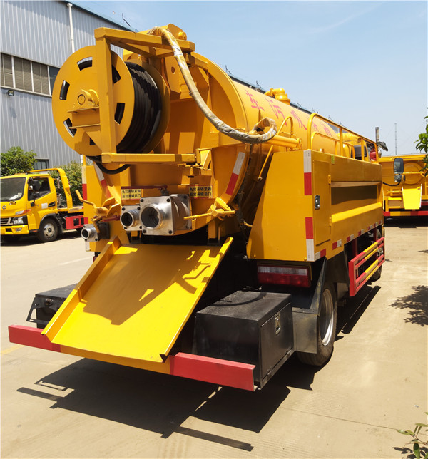 藍牌高壓清洗吸污車,車輛采用東風多利卡底盤,黃色豪華駕駛室帶空調,液壓助力離合助力,鋼絲胎,3308軸距,700鋼絲胎(帶備胎)帶ABS防抱死系統,污罐容積3.8立方(武鋼優質鋼板6個厚)水箱1.5立方(武鋼優質鋼板4個厚)配備德國品孚170L流量高壓泵,山東SK-9水循環真空泵,尾部一個100吸污口,一個100自流,尾部帶鎖緊裝置,帶水污互通,洗手裝置,其余廠家標配