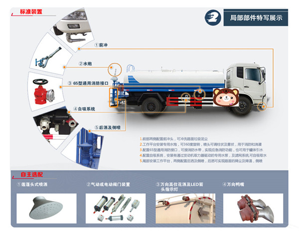 隨州灑水車上裝配置:罐體有效容積約為15立方灑水車,隨州億豐泵,罐體鋼板為4MM碳鋼,罐體及整車外形尺寸按照公告。整車前沖、后灑、側噴、帶65消防接口,后平臺帶泡不帶門,前封頭帶水位計,后平臺主管路帶1寸澆花接口,后爬梯。平臺后部帶小安全告知牌:“隨時停車,注意安全”,帶兩根水管及陰陽端。罐體顏色:上白色下東風蘭,罐體兩側噴“灑水車”,貼反光標示。
