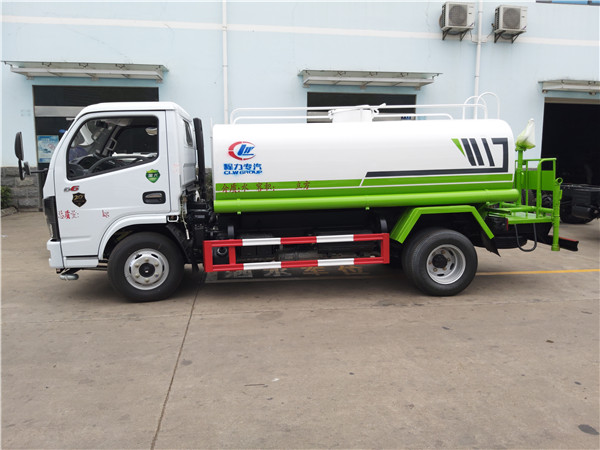灑水車噴水出口: 前沖,后灑,后工作臺高炮,前沖(噴)后灑、帶側噴(花灑)、帶后工作平臺、平臺上安裝綠化灑水高炮(炮有大雨、中雨、毛毛雨、霧狀可調節),帶吸水管,帶消防接頭