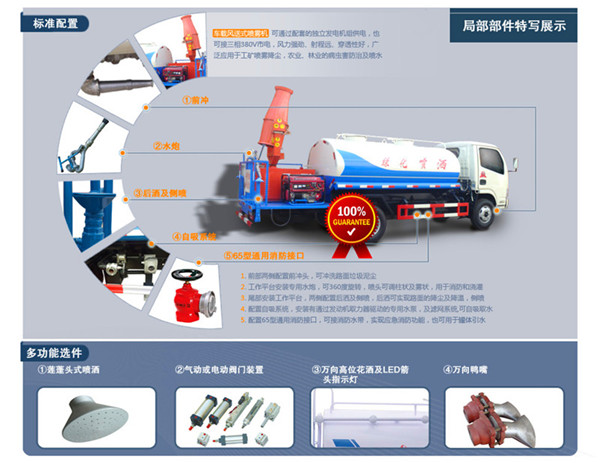 灑水車前裝有鴨嘴形噴嘴或圓頭沖嘴,后面裝有圓柱形灑水噴嘴或蓮蓬頭噴嘴,后部有一工作平臺,裝配有水炮。后部還可裝8個噴嘴。