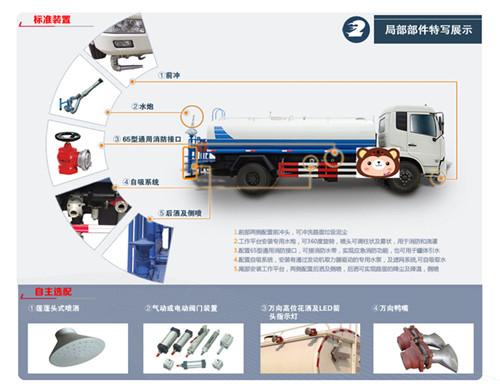 從中我們可以了解到灑水車行駛的路況,用戶看重灑水車哪部分的功能。如果路面平坦,那么就不需要太大的發動機動力,如果路面陡峭,則要選用大馬力的發動機。如果是綠化灑水,那么就要注意選用合適的噴頭,水炮的性能也相對關鍵些。