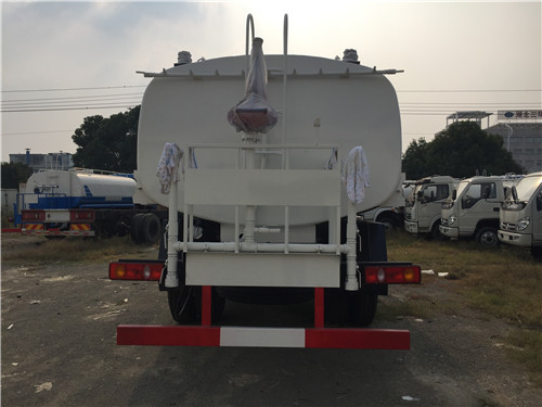 灑水車前裝有鴨嘴型噴霧或圓頭沖嘴,后面裝有圓柱形灑水砣,側(cè)噴花灑蓮花頭,車后部裝有高射噴槍。(選裝)