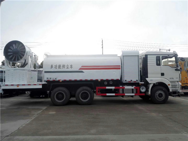 目前最受房地產歡迎的多功能抑塵車為噴霧抑塵車,該車除了常規的抑塵車的配置以外,還加裝了一套噴霧系統,噴霧系統主要由電機,電泵和噴灑總成組成,最大作業半徑為35米,可以遙控電控,噴霧系統可以旋轉,點頭工作。噴霧系統最大電機功率高達5.5千瓦,水泵點功率6千瓦,風機攜帶18個噴霧頭,噴霧頭可更換。