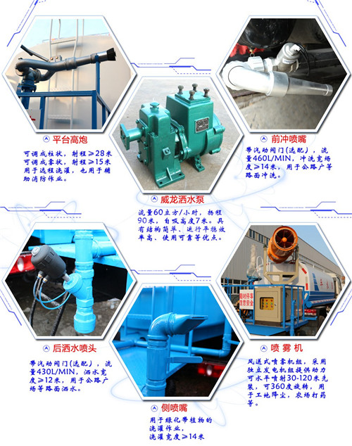 抑塵車主要的作用是各種環境下的灑水、噴霧、除塵、降溫等,運用在路面養護,道路清潔,園林噴灑,抗旱救災,抑塵除霾,運輸飲用水等;適用于沖洗路面保持道路濕潤降低灰塵漫天,抑塵車還可以給綠化帶澆花澆樹,抑塵車還可以在工地、廠區、煤場等路況降塵灑水,更可以作為緊急消防水車。下面程力專汽生產的抑塵車為例來介紹下其各組成部分的功能如下:
