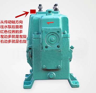 2、如果看不到灑水泵標牌,那么就按照張部長教的方法,從水泵傳動軸方向往后看,看看水泵上不進水口位置兩次多出來的空間,哪邊多,就是什么旋轉(zhuǎn)的,如下圖,左邊的空間多,那么就是左旋的。國內(nèi)的灑水車水泵廠家,都可以這樣區(qū)分。